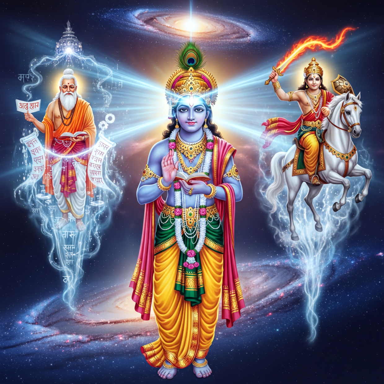 Krishna represents complete divine intelligence — playful yet profound, loving yet firm, practical yet deeply spiritual.
